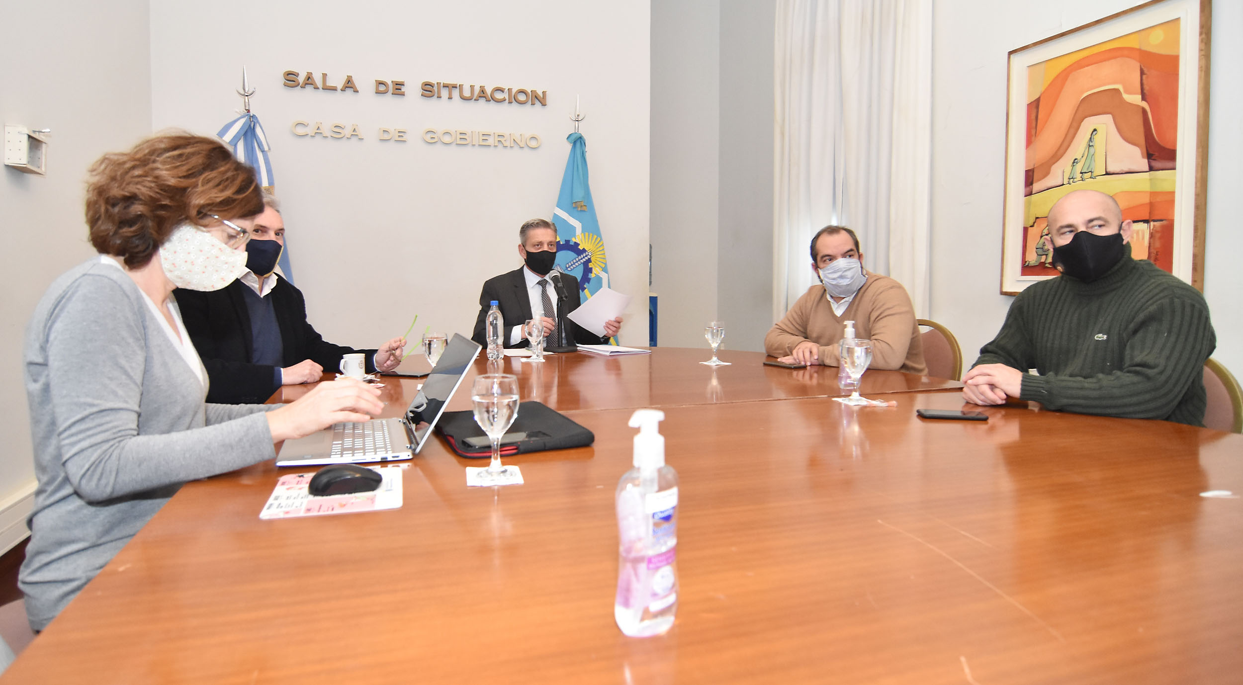 El encuentro se realizó a través del sistema de videoconferencia y acompañaron al mandatario provincial los ministros de Salud, Fabián Puratich; de Gobierno y Justicia, José María Grazzini; y de Seguridad, Federico Massoni, además de la asesora General de Gobierno, Carolina Rodríguez, y la directora Provincial de Patologías Prevalentes y Epidemiología, Teresa Strella.