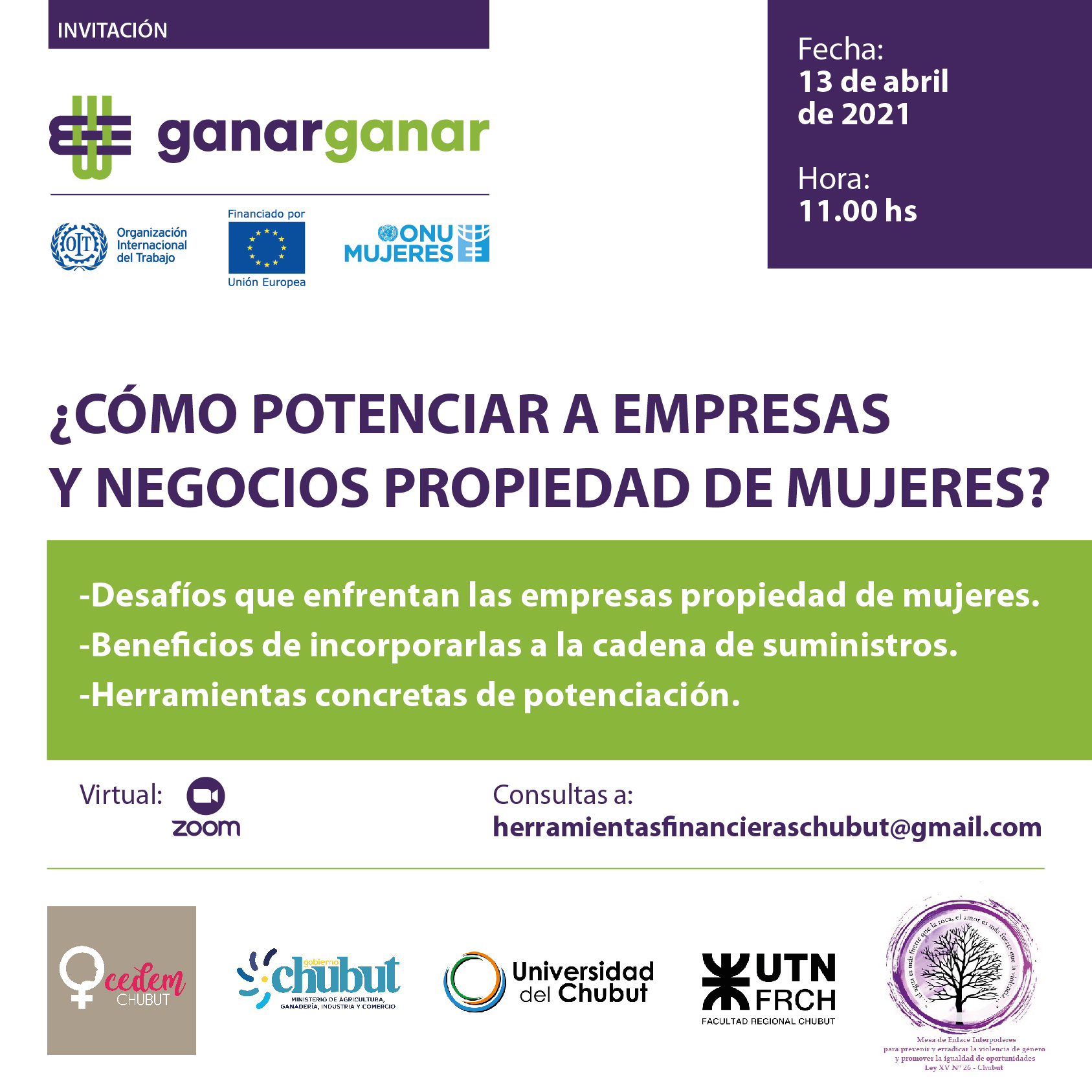 El Taller online «¿Cómo potenciar a empresas y negocios propiedad de mujeres?» es organizado por el Centro de Desarrollo Económico de la Mujer en la Provincia del Chubut (CEDEM), la Universidad del Chubut, la Universidad Tecnológica Nacional (UTN), la Mesa de Enlace Interpoderes y la Organización de las Naciones Unidas (ONU) Mujeres Argentina.