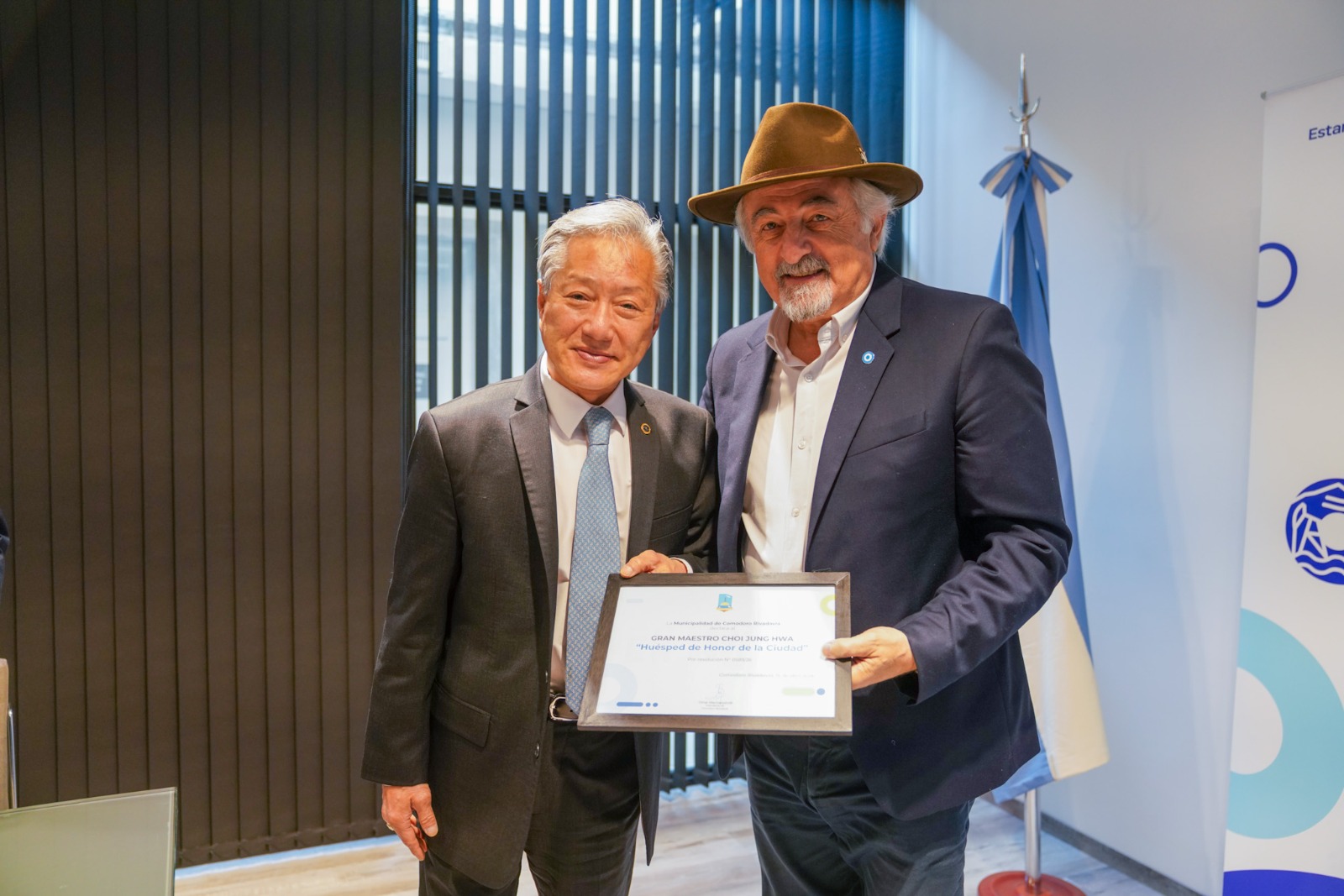 El intendente de Comodoro Rivadavia, Othar Macharashvili, recibió en su despacho al Gran Máster Choi Jung Hwa, referente internacional del taekwondo e hijo del creador de la disciplina, en el marco de su visita a la ciudad donde brindará una masterclass destinada a deportistas de la ciudad.