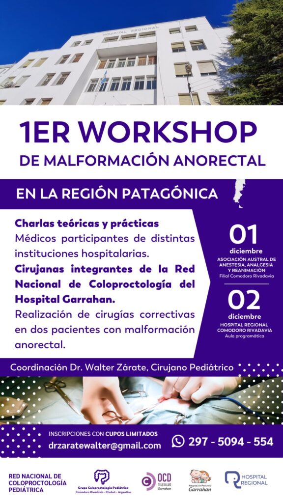 Este viernes 1 y sábado 2 de diciembre se realizará el primer workshop de malformación anorectal en Comodoro Rivadavia, organizado por el Dr. Walter Zárate, coordinador del Grupo de Coloproctología Pediátrica del Hospital Regional que integra la Red del Hospital Garrahan que nuclea a los especialistas en el área. “Venimos trabajando hace 5 meses para este encuentro teórico-práctico que será presencial y se transmitirá de forma virtual para profesionales de Argentina, Ecuador, Colombia, Uruguay, Chile, Perú y Brasil. Además el sábado operaremos junto a médicas de primer nivel en los quirófanos del Regional” reveló el Dr. Zárate.