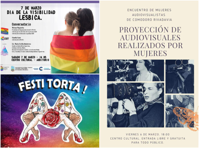 SÁBADO 7/3: DÍA DE LA VISIBILIDAD LÉSBICA• 16hs: Conversatorio y taller con Miriam Maguicha, Claudia Cano y Maria Cecilia Quinteros. Auditorio Centro Cultural. Entrada libre y gratuita.• 21hs: Festi Torta. Sin hombres hetero/cis . La Parra Comunitaria. Bono contribución $100.