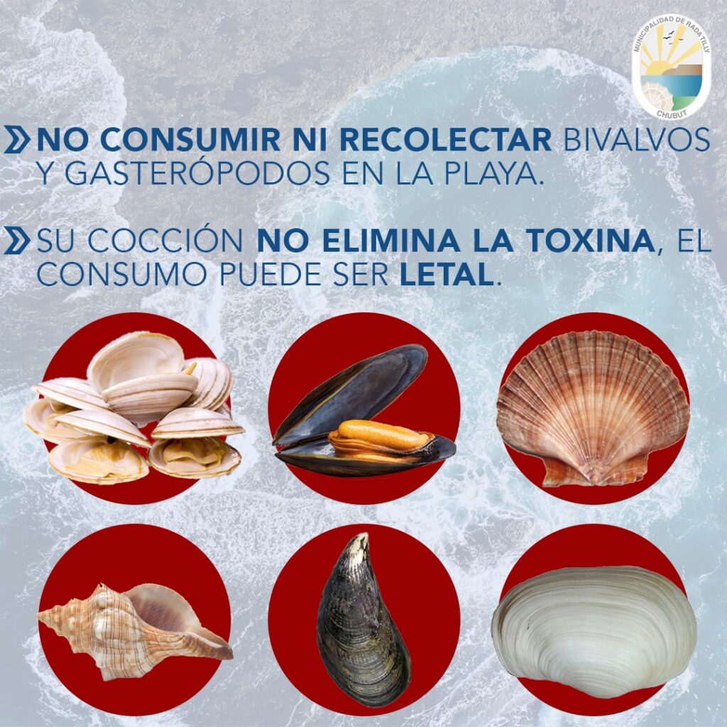 La Dirección de Bromatología de la Municipalidad de Rada Tilly, reitera la detección del fenómeno de marea roja y recuerda a la población en general, abstenerse a recolectar y consumir moluscos bivalvos y monovalvos en la playa de este ejido municipal.
