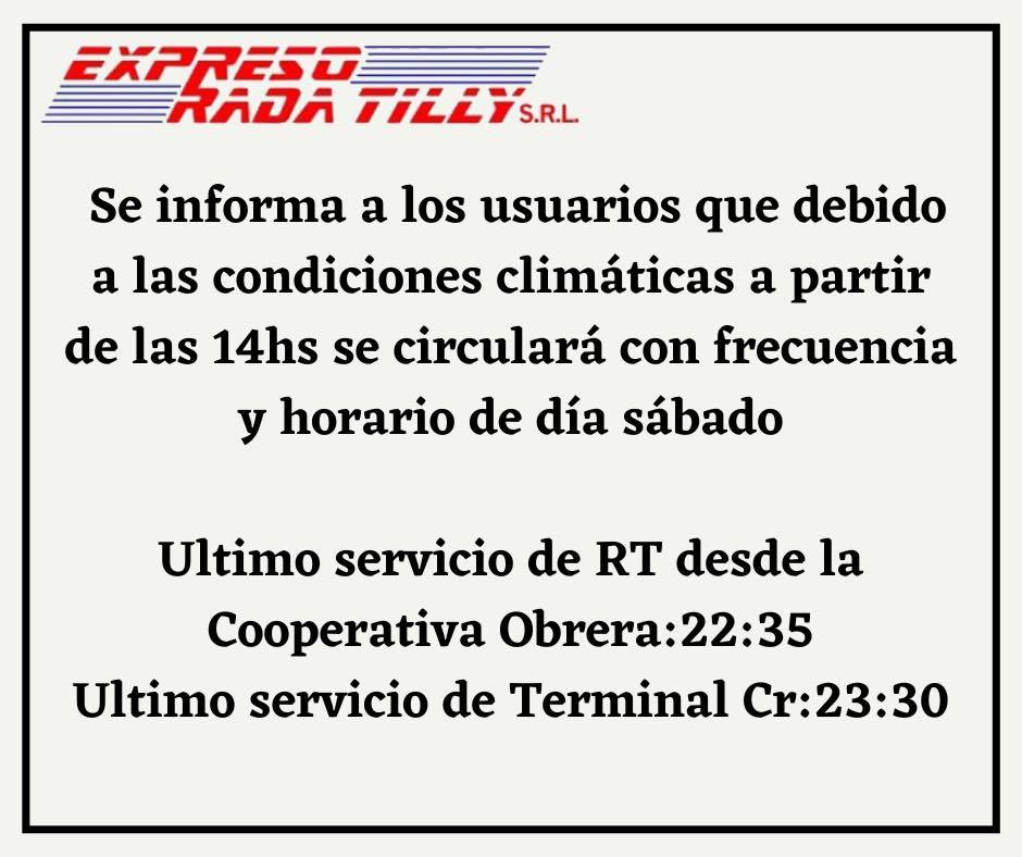 Rada Tilly Desde la tarde, colectivos de Rada Tilly circularán con la frecuencia y horarios del día sábado Por redaccion - 20 de septiembre de 2022 0 315 FacebookXPinterestWhatsApp Publicidad A través de un comunicado, Expreso Rada Tilly informó a los usuarios que debido a las condiciones climáticas a partir de las 14 horas se circulará con frecuencia y horario de día sábado. Publicidad