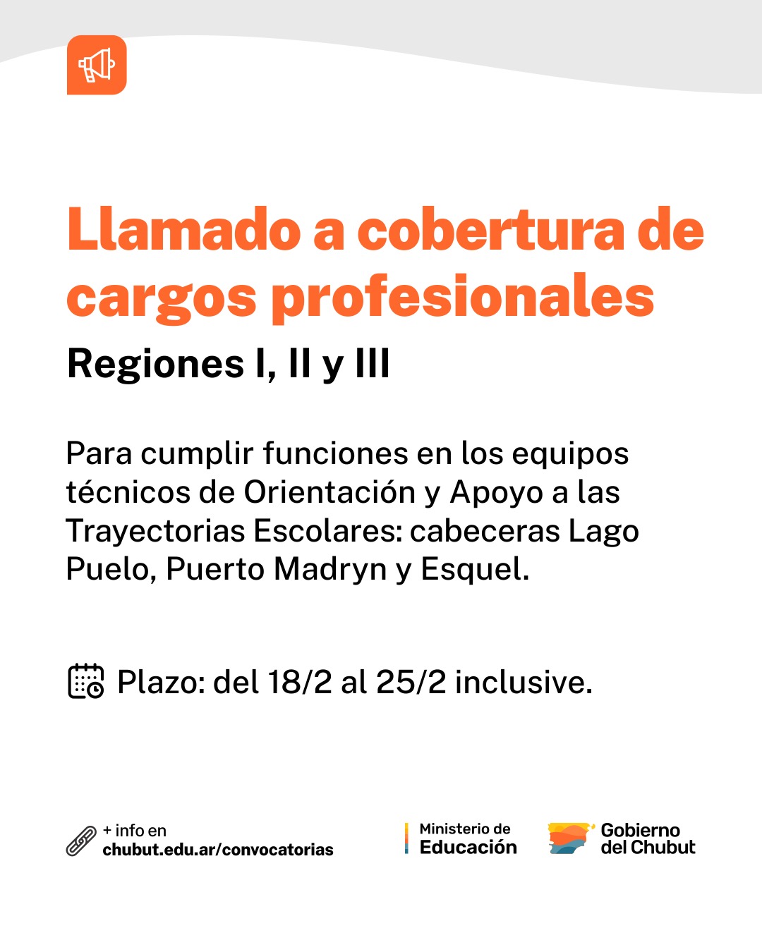 Para la Región II, con cabecera en Puerto Madryn, el llamado contempla la incorporación de dos (2) profesionales; en tanto en la Región III se convoca a la cobertura de dos (2) cargos profesionales, con cabeceras en Esquel, uno de ellos con residencia en Gobernador Costa o José de San Martín, y otro en Esquel o zonas cercanas.