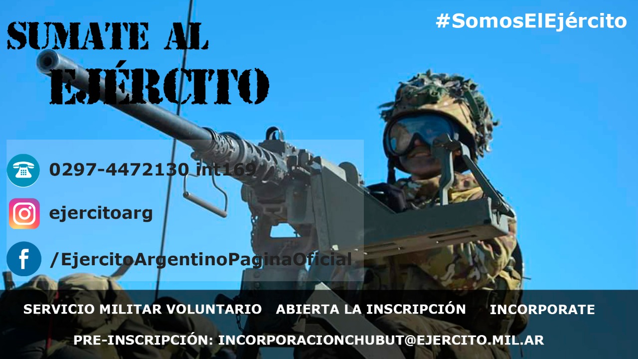 La Pre-Inscripción se podrá hacer de manera On-Line solicitando la documentación a través del mail incorporacionchubut@ejercito.mil.ar
