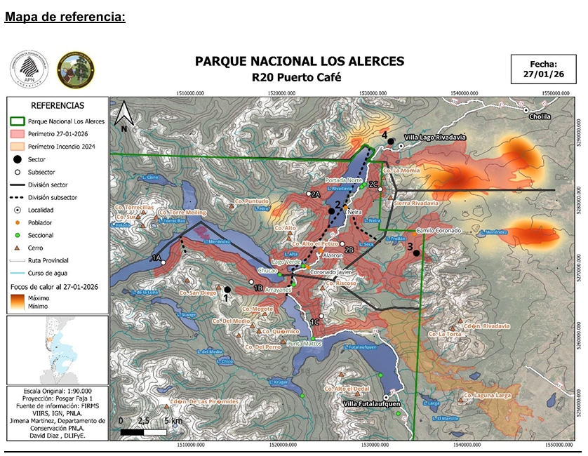 El incendio que afecta al Parque Nacional Los Alerces continúa activo y ya se estima que alcanzó unas 15 mil hectáreas, según informó la Administración de Parques Nacionales (APN). El reporte fue emitido este miércoles 28 de enero, desde Villa Futalaufquen, luego de una jornada marcada por múltiples rebrotes y desplazamientos de los focos activos, aunque con una leve mejora en las condiciones climáticas.