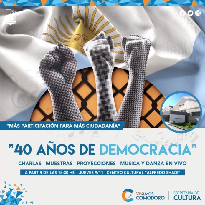 La Secretaría de Cultura desarrollará una serie de propuestas junto a la UNPSJB bajo el lema “Más participación para más ciudadanía” en base a la celebración de los 40 años de democracia en Argentina. La cita será este jueves en el Centro Cultural, desde las 15:00 horas, con entrada libre y gratuita y el cierre artístico estelar con Yamila Cafrune y Mariano Saravia.