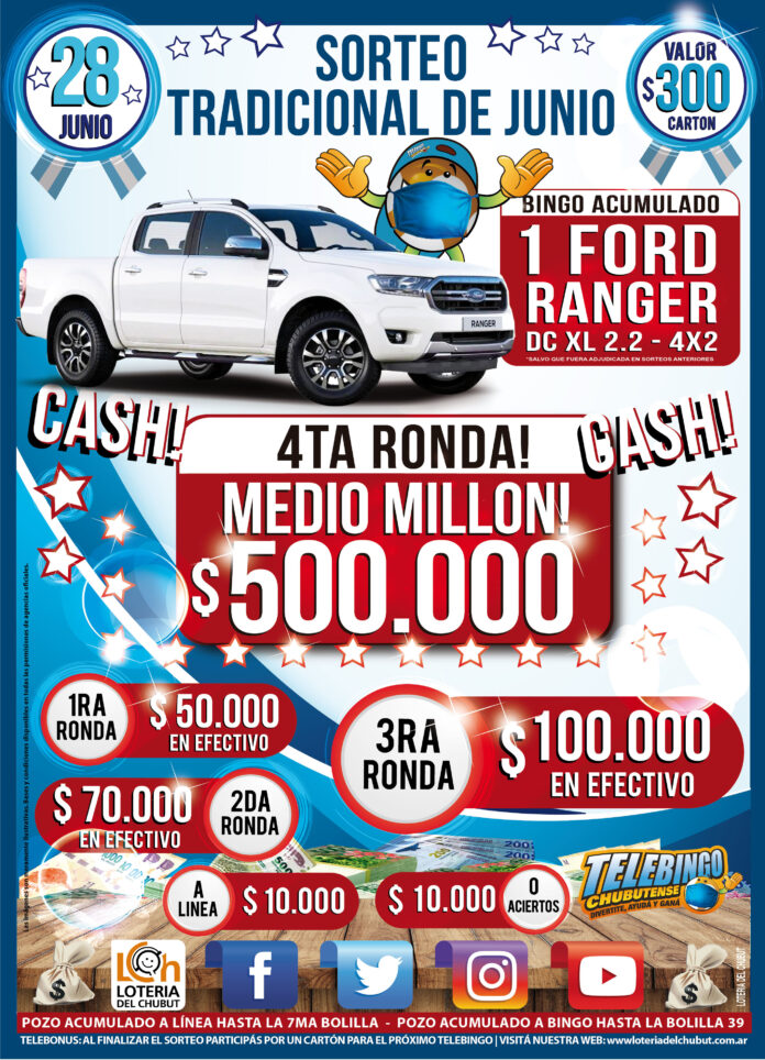 El próximo domingo 28 de junio, el Telebingo Chubutense que se realizará en la Sala de Sorteos de Lotería del Chubut en la ciudad de Rawson, sorteará en la Cuarta Ronda a Bingo 500.000 pesos; en la Tercera 100.000 pesos; para la Segunda Ronda 70.000 pesos y para la Primera $ 50.000. Premio a Línea 10 mil pesos y 10.000 a 0 Aciertos sumando un total de $ 800.000 en efectivo, además una camioneta Ford Ranger doble cabina 2.2 como premio a Pozo Acumulado Bingo.
