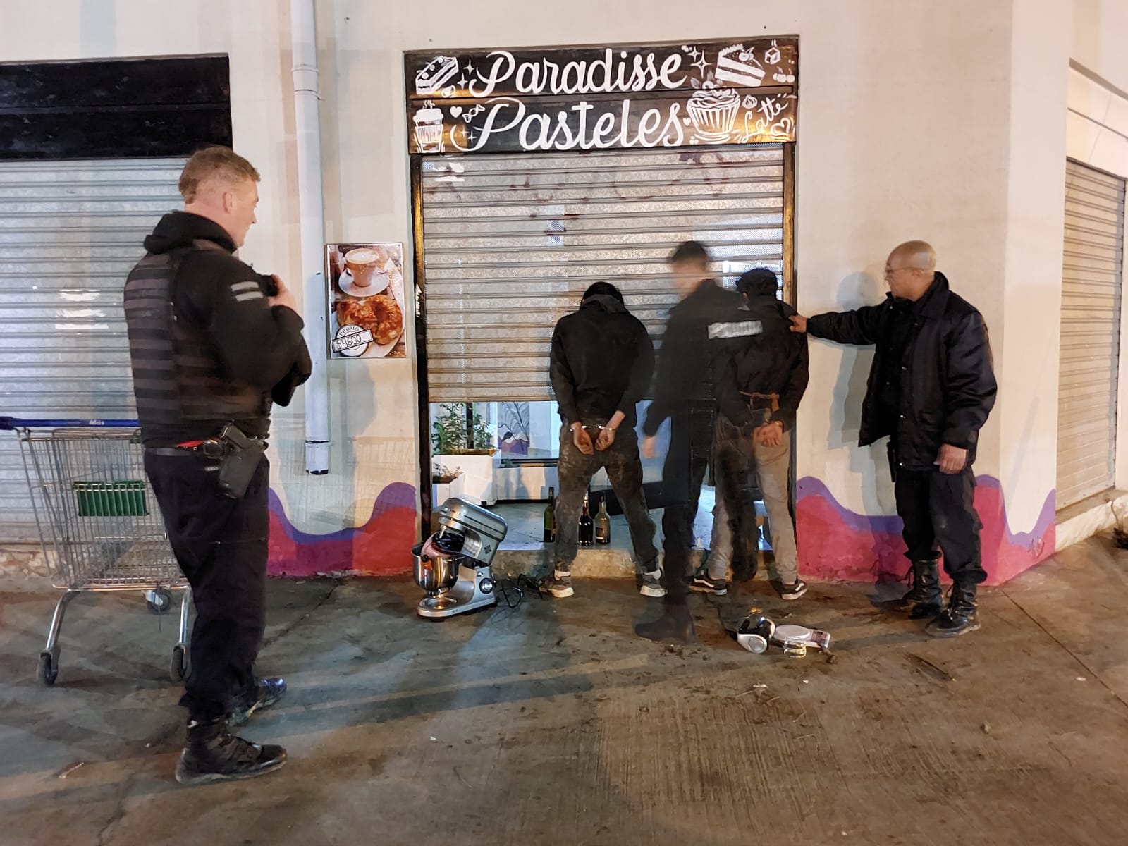 En momentos en que efectivos policiales realizaban un patrullaje preventivo, observaron a dos hombres salir del interior de la Pastelería, con elementos como máquina amasadora, cafetera, batidora y bebidas varias.