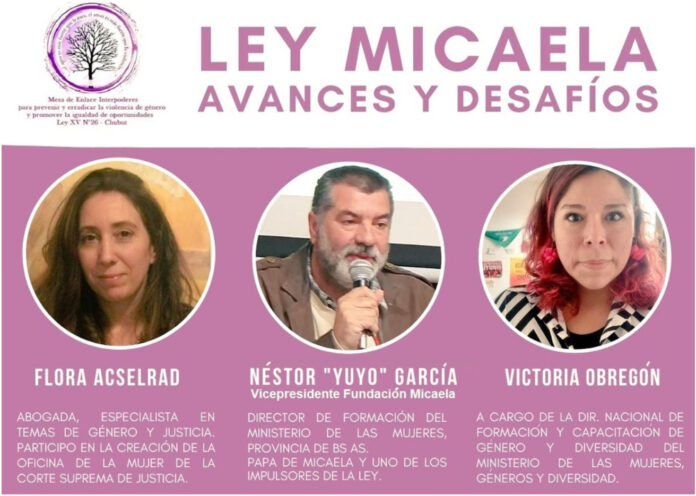 Del evento participan Néstor García (Yuyo), padre de Micaela García; Flora Acselrad -quien ideó y elaboró el primer proyecto que luego se transformó en la Ley Micaela-; y Victoria Obregón, a cargo de la Dirección Nacional de Formación y Capacitación en Género y Diversidad del Ministerio de las Mujeres, Géneros y Diversidad.