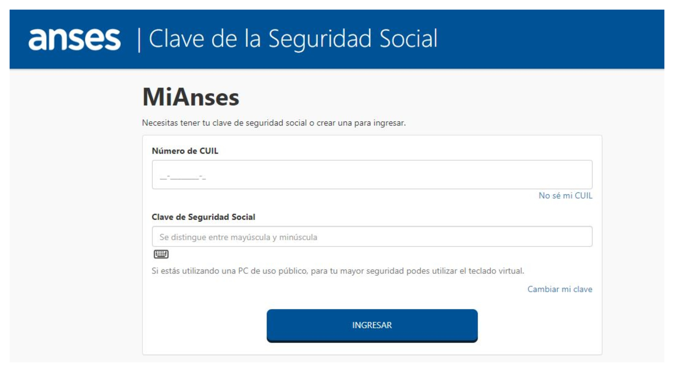 Para acceder, la persona interesada debe ingresar con su número de CUIL y la Clave de la Seguridad Social. Si no cuenta con esta clave, la puede generar en el momento.