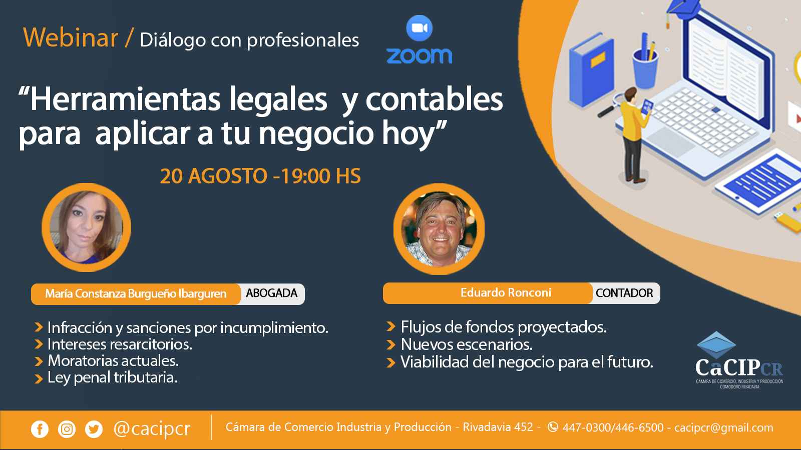 La Cámara de Comercio, Industria y Producción de Comodoro Rivadavia y Rada Tilly invitan a participar este jueves 20 de agosto a las 19hs de un Webinar totalmente gratuito, destinado a comercios, empresas o emprendimientos, en cual dos profesionales de la materia los guiaran en aspectos legales y contables para tener en cuenta en el escenario cambiante que se nos presenta hoy.