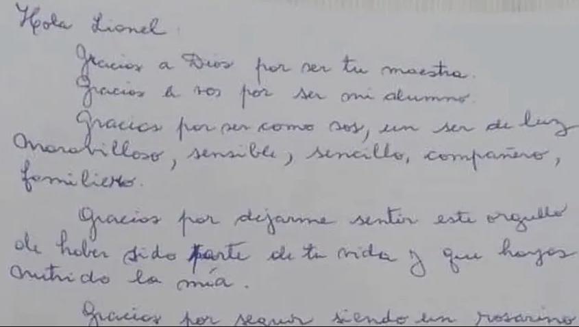 Hola Messi. Gracias a Dios por ser tu maestra. Y gracias a vos por ser mi alumno. Gracias por ser como sos. Nunca cambies.