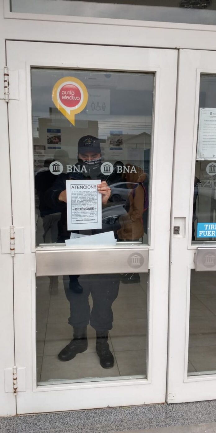 Con panfletos en manos, los agentes recorrieron hoy distintas sucursales bancarias donde colocaron un cartel en cada sucursal advirtiendo sobre este tipo de modalidad de estafa para prevenir y alertar a los vecinos.
