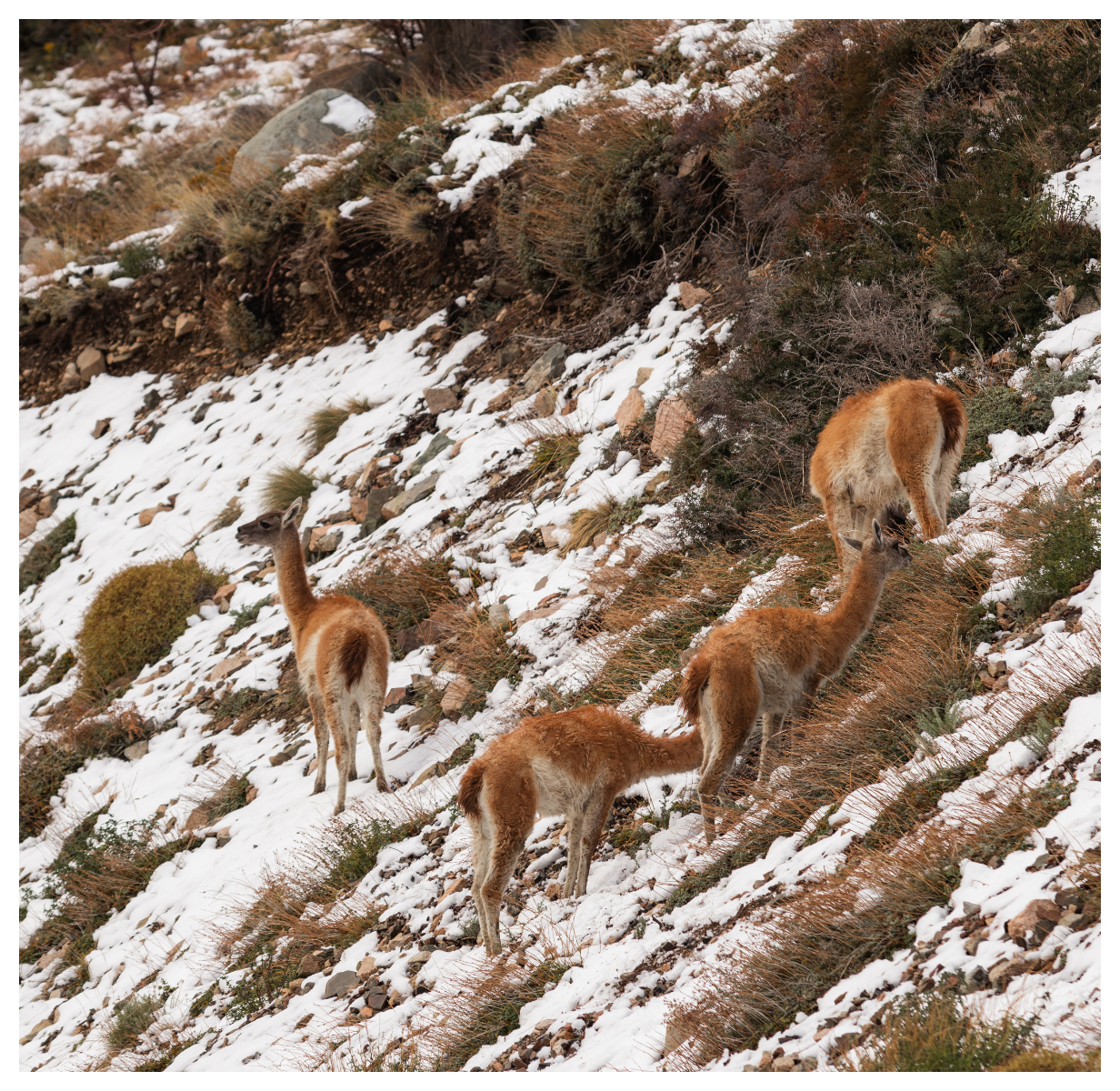 La intensa nevada cubre la ruta de blanco anticipo del invierno. Más atrás, entre los copos que se precipitan incesantemente y el clásico silbido gélido del viento, las montañas son apenas manchones oscuros que se descubren afinando la mirada. Unos metros más acá, los guanacos avanzan lentamente, como despreocupados, en manada. Sin miedo a los depredadores ni al ser humano.