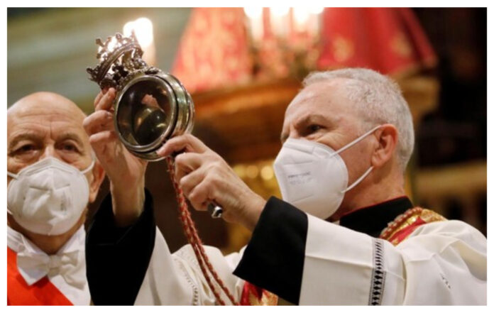 La tradición es secular. El relicario con la supuesta sangre del santo, en estado sólido, es sacudido por el arzobispo o un monseñor ante los fieles y se convierte en líquido. Así ha ocurrido casi siempre en las tres veces en que es sacado de su lugar habitual, en una capilla de la catedral: El sábado previo al primer domingo de mayo, el día 19 de septiembre, que es su fiesta patronal, y cada 16 de diciembre. Ayer, se intentó dos veces, en la mañana y a las 19:40. Ante la decepción, el cardenal Crescenzio Sepe, que presidía la celebración litúrgica, advirtió que no había ocurrido un drama: «Rezad al patrón, no nos abandonará», dijo el cardenal Sepe.