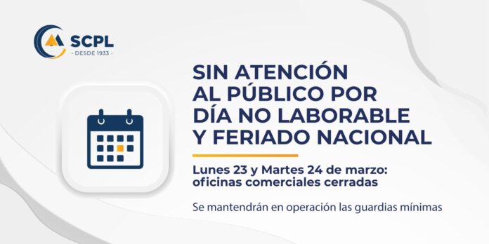 Desde la Sociedad Cooperativa Popular Limitada (SCPL) comunicaron a sus asociados que durante el lunes 23 y martes 24 de marzo no habrá atención al público en las oficinas comerciales ni en otras dependencias de la institución.