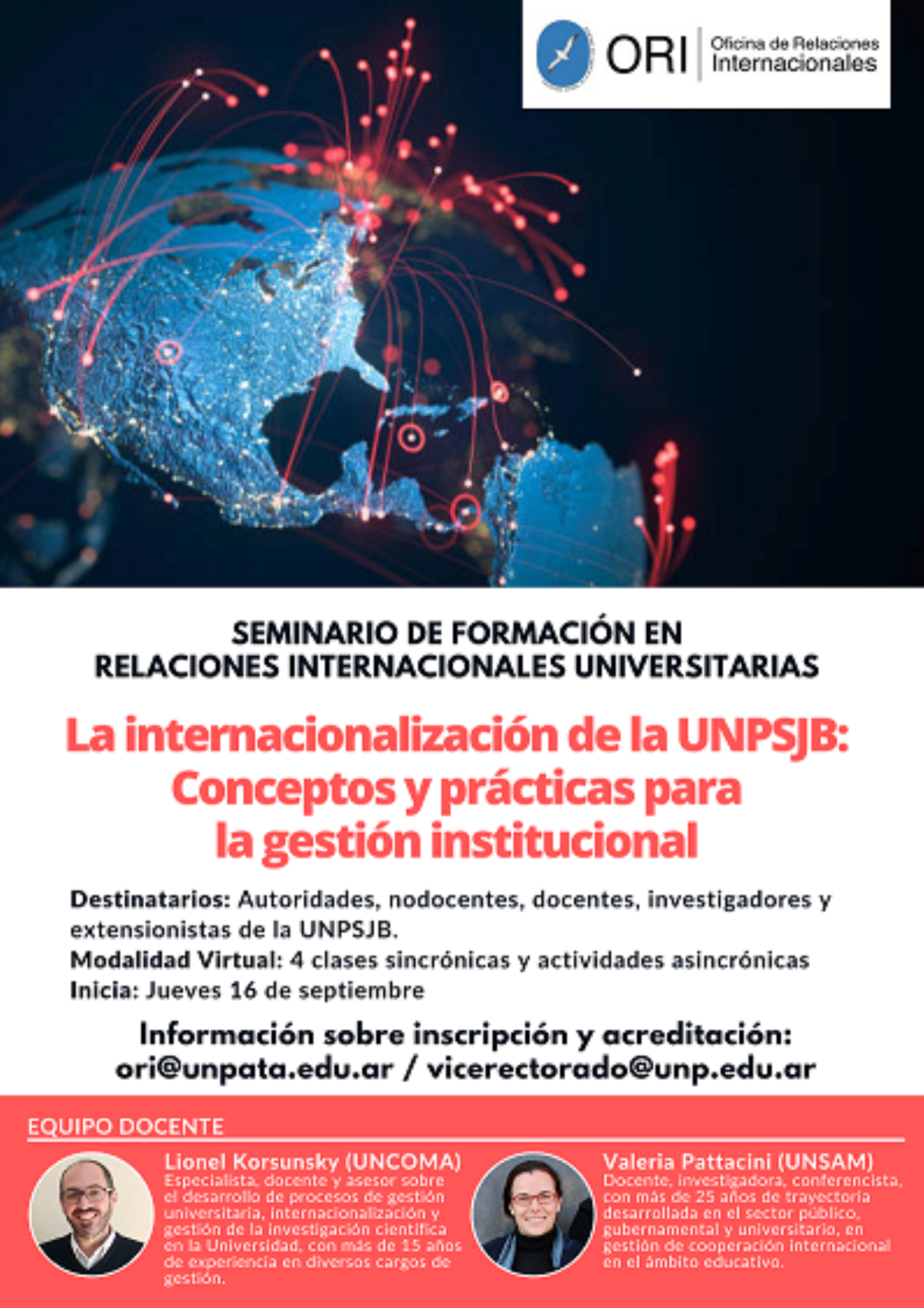 La Universidad Nacional de la Patagonia San Juan Bosco (UNSPJB), a través del Vice Rectorado y la Oficina de Relaciones Internacionales (ORI), organiza el Seminario de formación en relaciones internacionales universitarias, que lleva por título: «La Internacionalización de la UNPSJB: conceptos y prácticas para la gestión institucional».