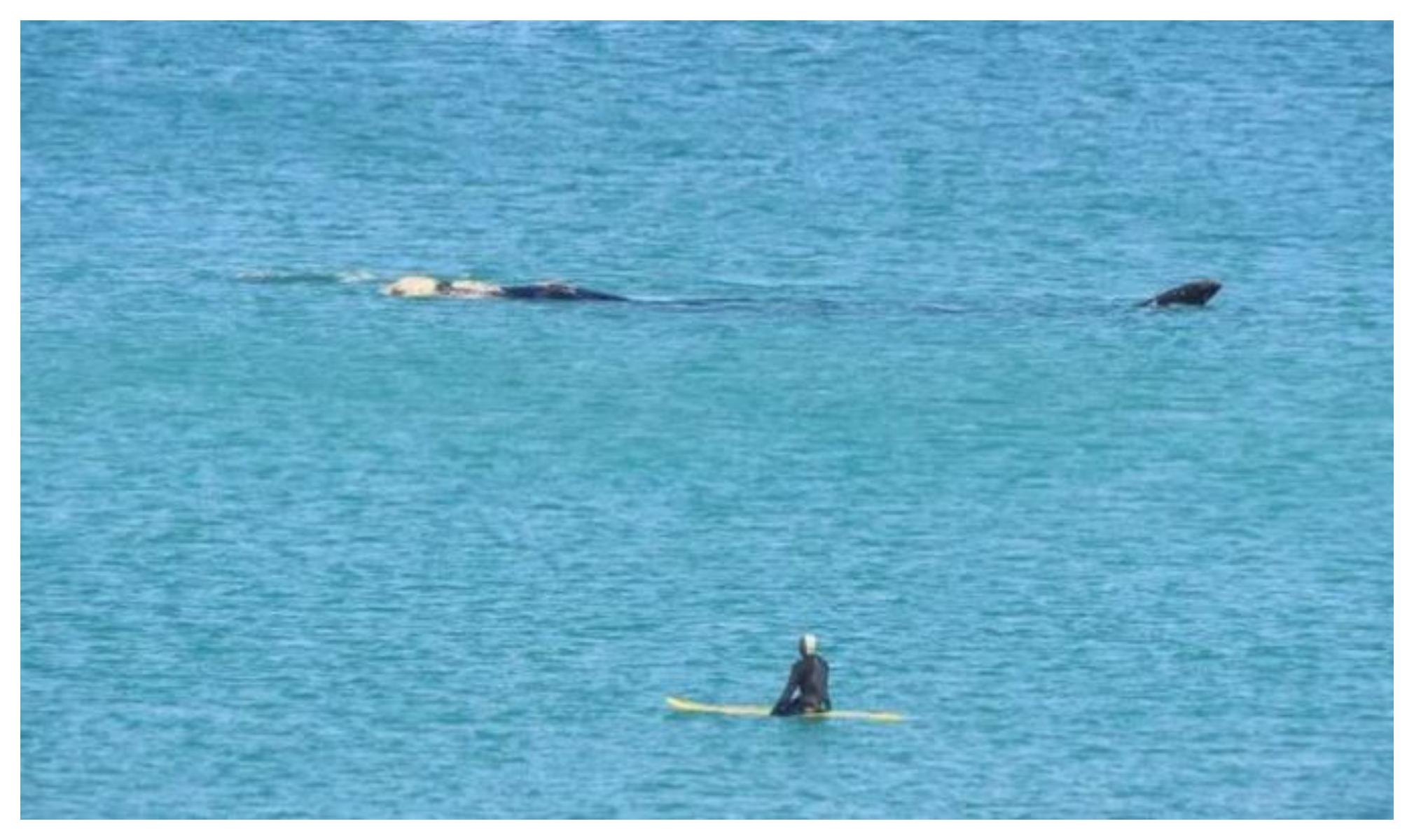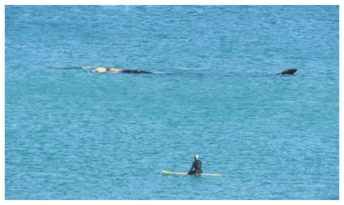 Un surfista de Las Grutas recibió la inesperada visita de una ballena franca austral mientras practicaba este miércoles junto con otros compañeros a la altura de la bajada Los Acantilados, aprovechando el buen oleaje de la pleamar y la soleada tarde.