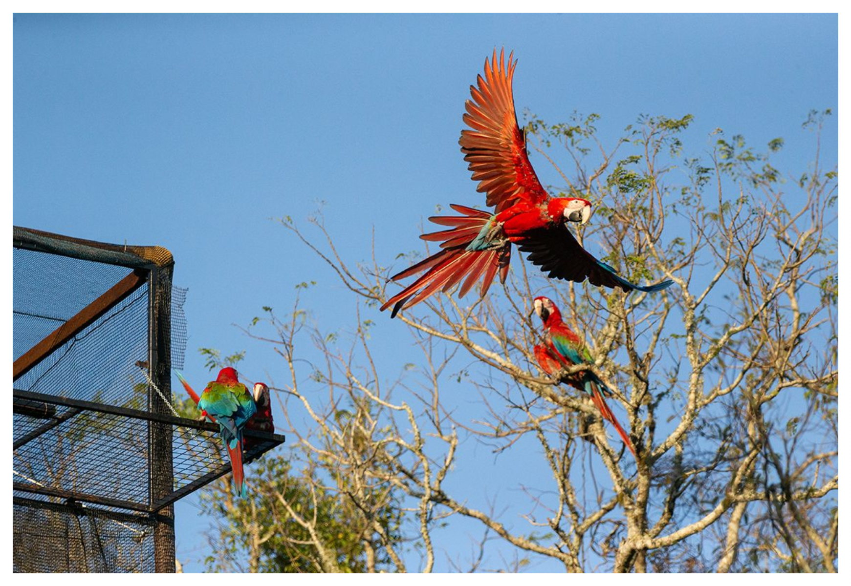 Cinco guacamayos rojos juveniles forman el segundo núcleo de liberación de la especie en Corrientes, luego de más de cien años de extinción en la provincia, y medio siglo en toda la Argentina. El proyecto, que lleva adelante Fundación Rewilding Argentina junto con el Gobierno de la Provincia de Corrientes y la Administración de Parques Nacionales, busca recuperar la fauna nativa de los Esteros del Iberá y generar un modelo sostenible de desarrollo a partir de la recuperación de ecosistemas y el turismo de naturaleza.