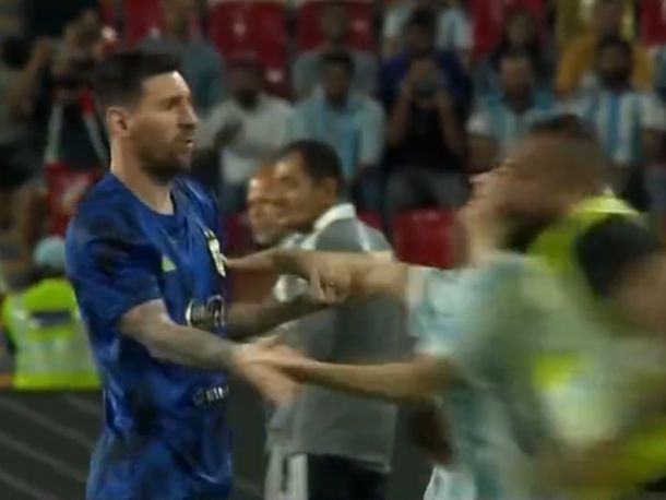 Una hincha se metió en el campo de juego y fue directamente a abrazar a Lionel Messi. Sin embargo fue tackleada por un seguridad que se encontraba al lado de la Pulga.