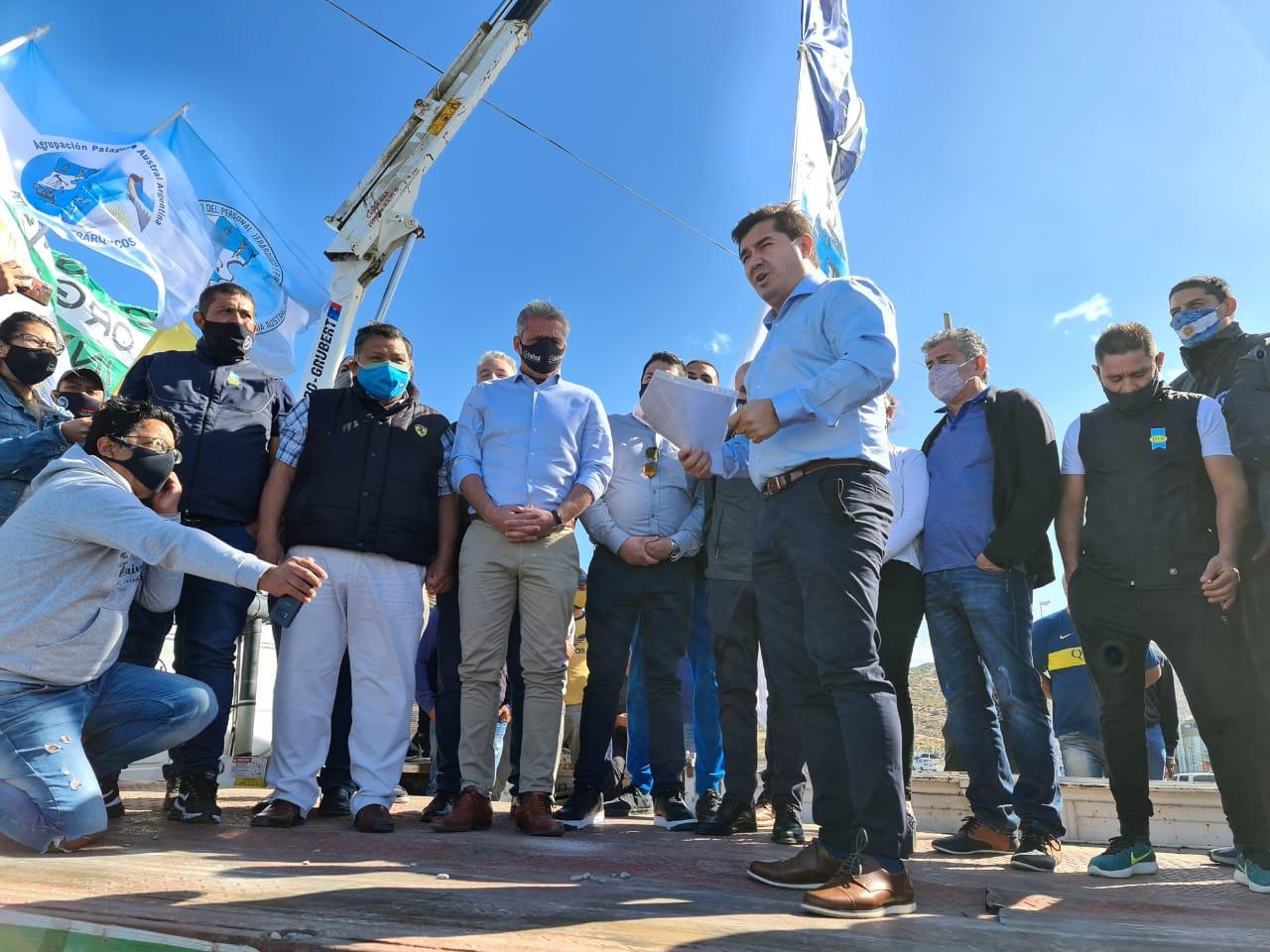El presidente de Petrominera, Héctor Millar, participó ayer del acto en Ruta 3 y 26 e hizo entrega al gobernador Mariano Arcioni, del documento en apoyo al debate para el desarrollo productivo de la Meseta, firmado por el frente unido que reúne a los principales sindicatos de Chubut.