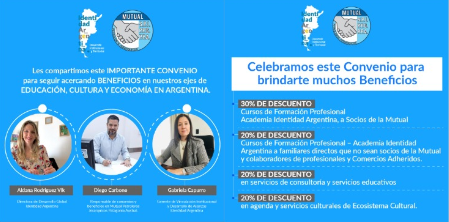 La entidad mutualista del Sindicato Petrolero Jerárquico de la Patagonia Austral conducida por José Dante Llugdar, cerró en la última semana un provechoso acuerdo con beneficio de descuentos para Afiliados y Socios Adherentes con la academia Identidad Argentina.
