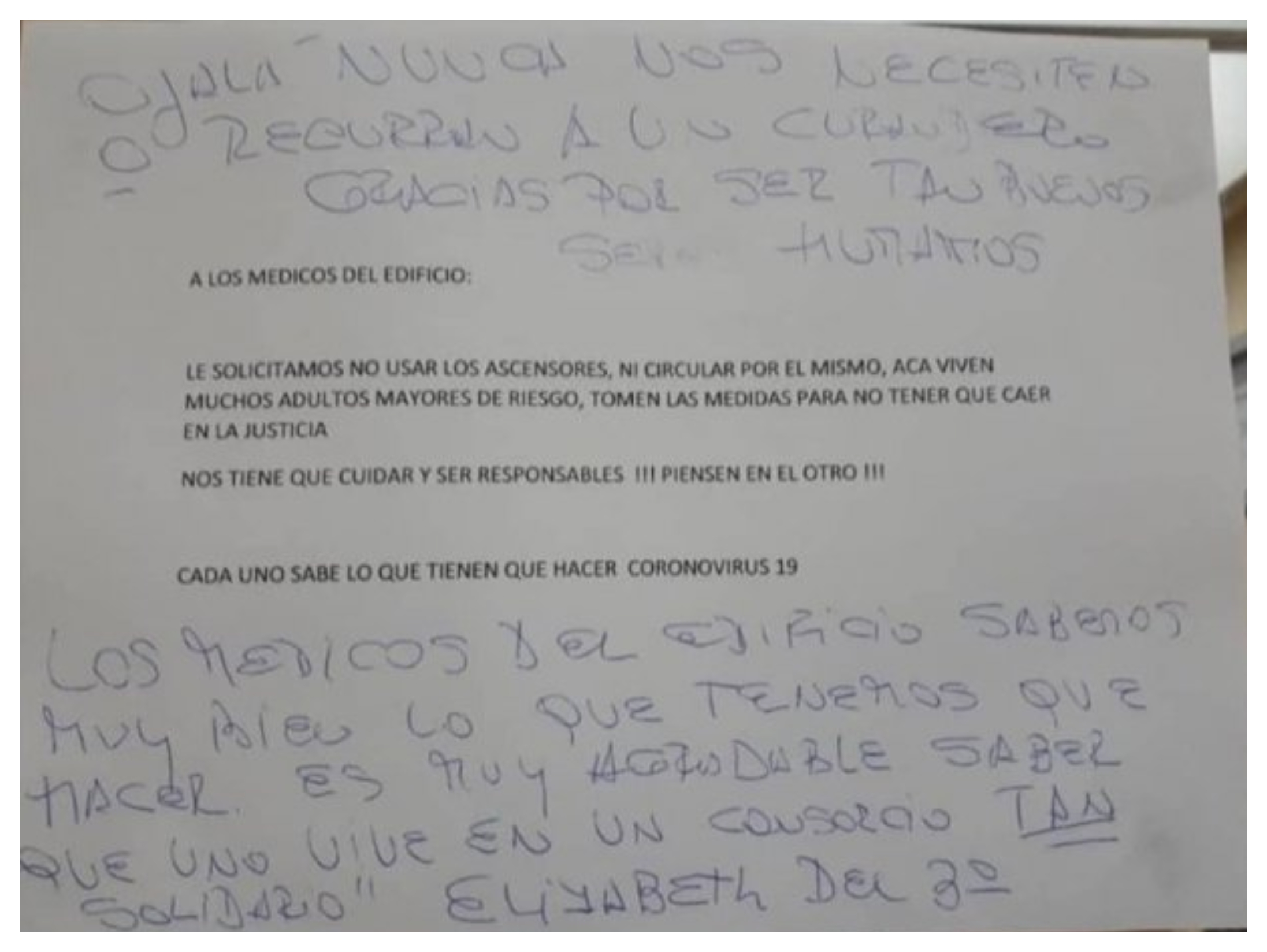 En este caso, el cartel que se viralizó fue escrito por una vecina quien pidió: “A los médicos del edificio: le solicitamos no usar los ascensores ni circular por el mismo. Acá viven muchos adultos mayores de riesgo”, y amenazan con que “tomen medidas para no tener que caer en la Justicia”.