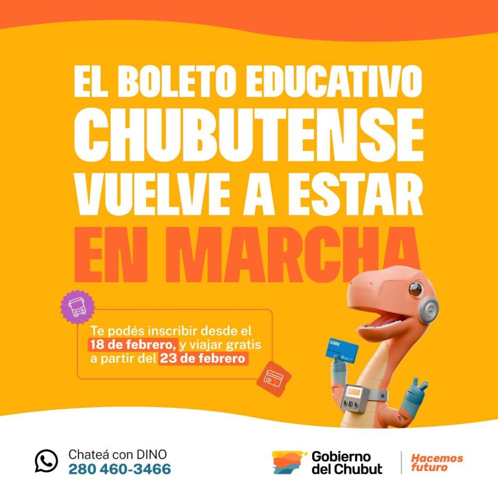 Para completar el trámite, los interesados deben ingresar a www.dino.gob.ar o comunicarse vía WhatsApp al +54 9 280 460-3466. Para acceder al beneficio, es necesario contar con DNI vigente y constancia de alumno regular o certificación laboral correspondiente al ciclo lectivo 2026.