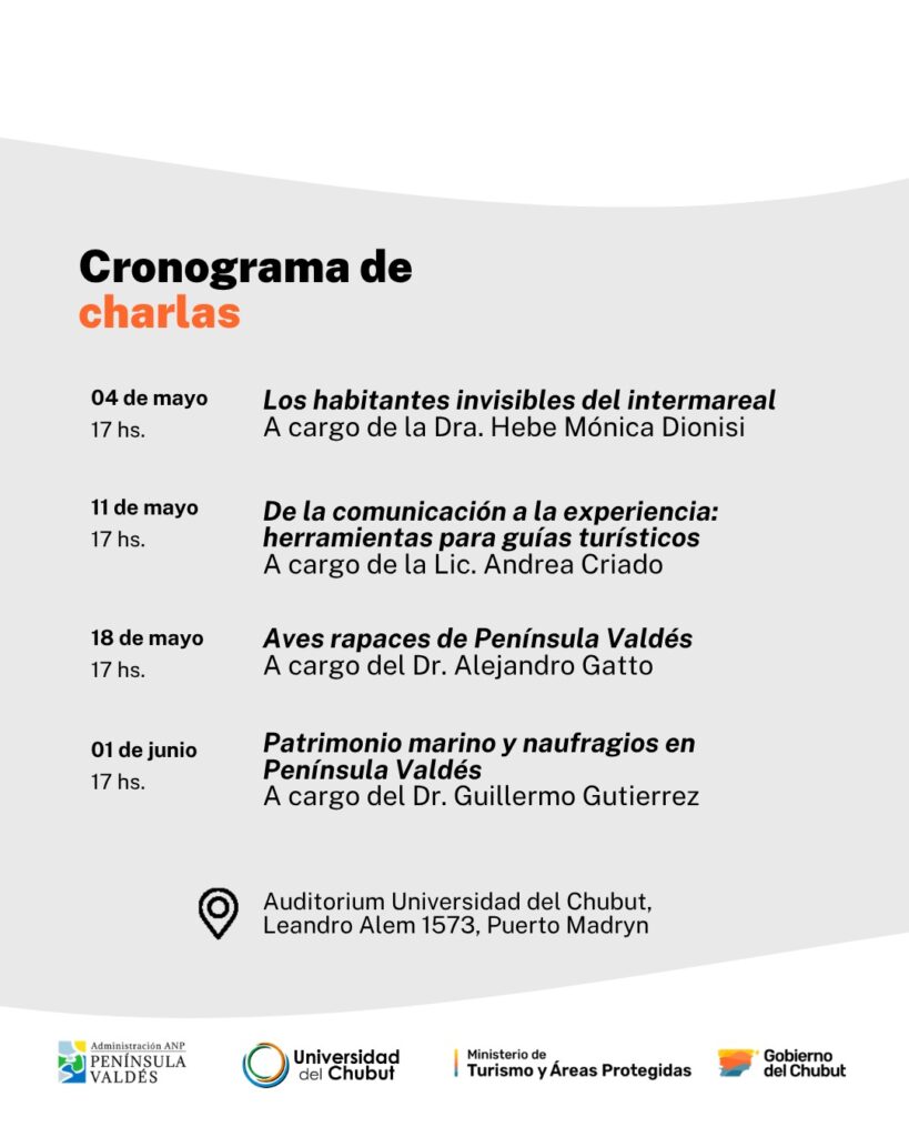 A lo largo del ciclo se abordarán temáticas vinculadas al ecosistema intermareal, la comunicación aplicada al turismo, las aves rapaces de Península Valdés y la historia del patrimonio marino y los naufragios del área.