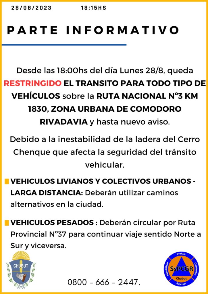 El Gobierno del Chubut, a través de la Administración de Vialidad Provincial (AVP), reforzó las tareas de mantenimiento en la Ruta Provincial N° 37, debido al corte de circulación en la Ruta Nacional N° 3 Km 1830, trama urbana de la ciudad de Comodoro Rivadavia.