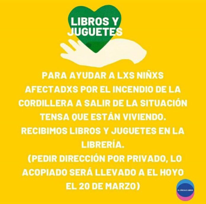 Mara Tacón de «El Círculo de Libros» ,una librería online con sede en Rada Tilly, estuvo en comunicación con Gen Radio para anunciar que realizará una colecta de libros y juguetes. Los mismos serán donados este fin de semana a un grupo de vecinos afectados por los incendios en la Comarca Andina de Chubut.