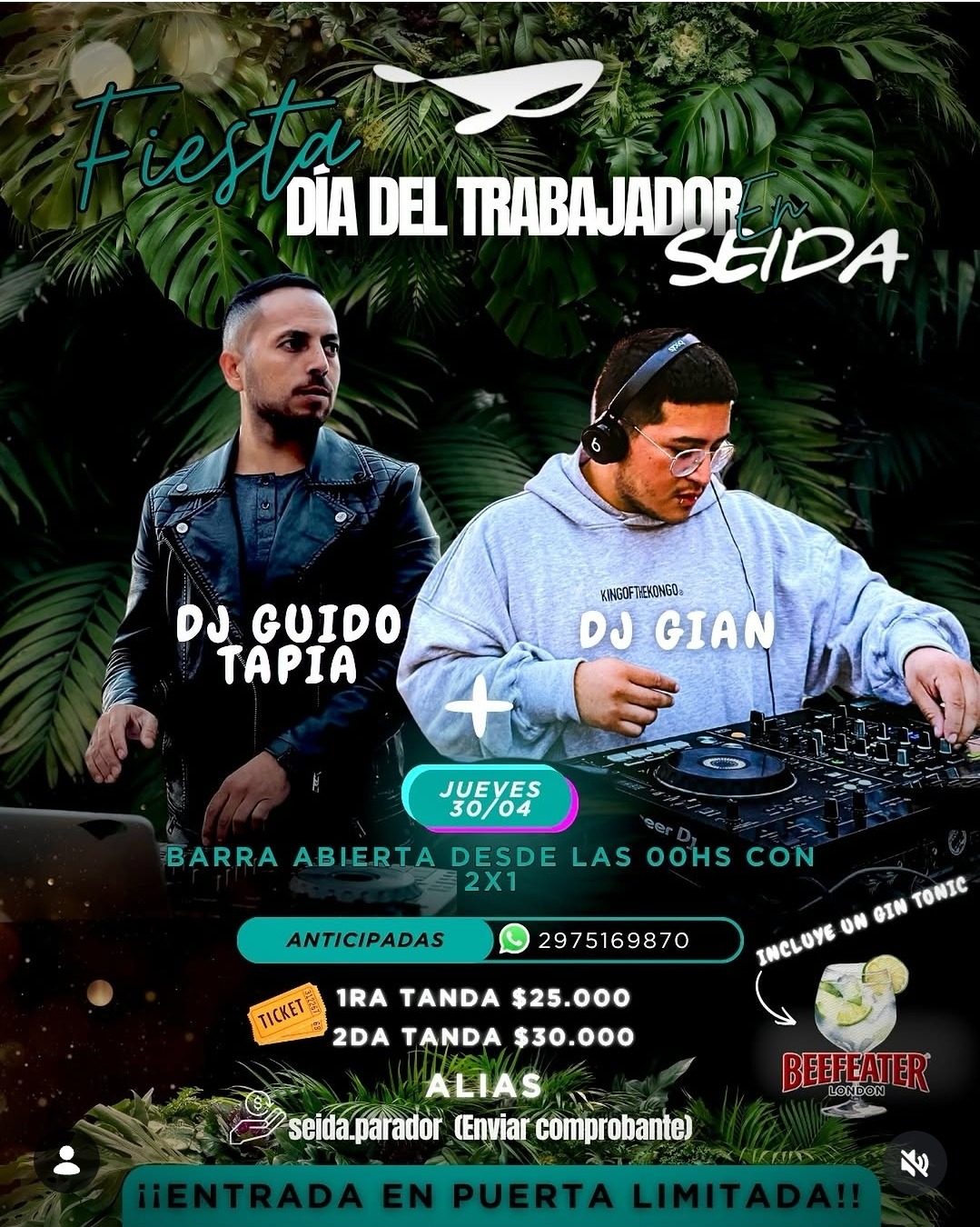 En paralelo, el jueves 30 de abril se celebrará la Fiesta por el Día del Trabajador en Seida, con la participación de los DJ Guido Tapia y DJ Gian. El evento comenzará a las 00:00 horas, contará con barra con promociones 2×1, incluirá gin tonic y tendrá entradas anticipadas disponibles al 2975169870. Se informó además que la capacidad en puerta será limitada.