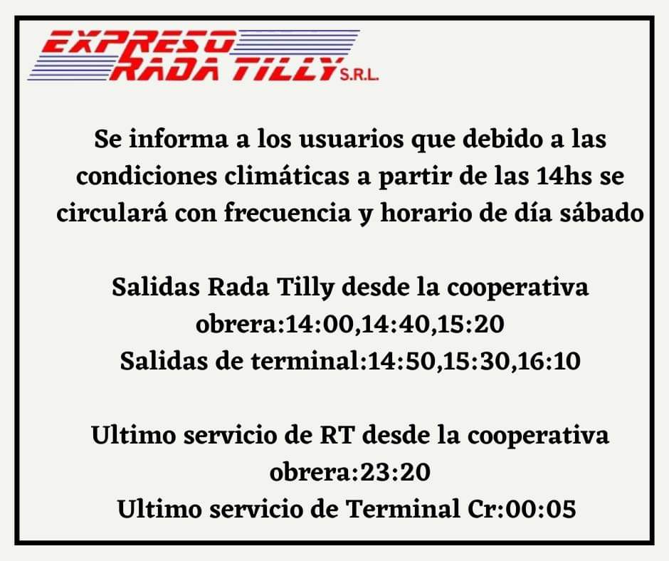 Si bien se mantiene el funcionamiento habitual del servicio, desde la órbita Municipal, informaron que se modificaron algunos recorridos, ya que muchas calles se encuentran intransitables en la localidad de Comodoro. Mientras que la empresa Expreso Rada Tilly, realizó cambios en los horarios de circulación.