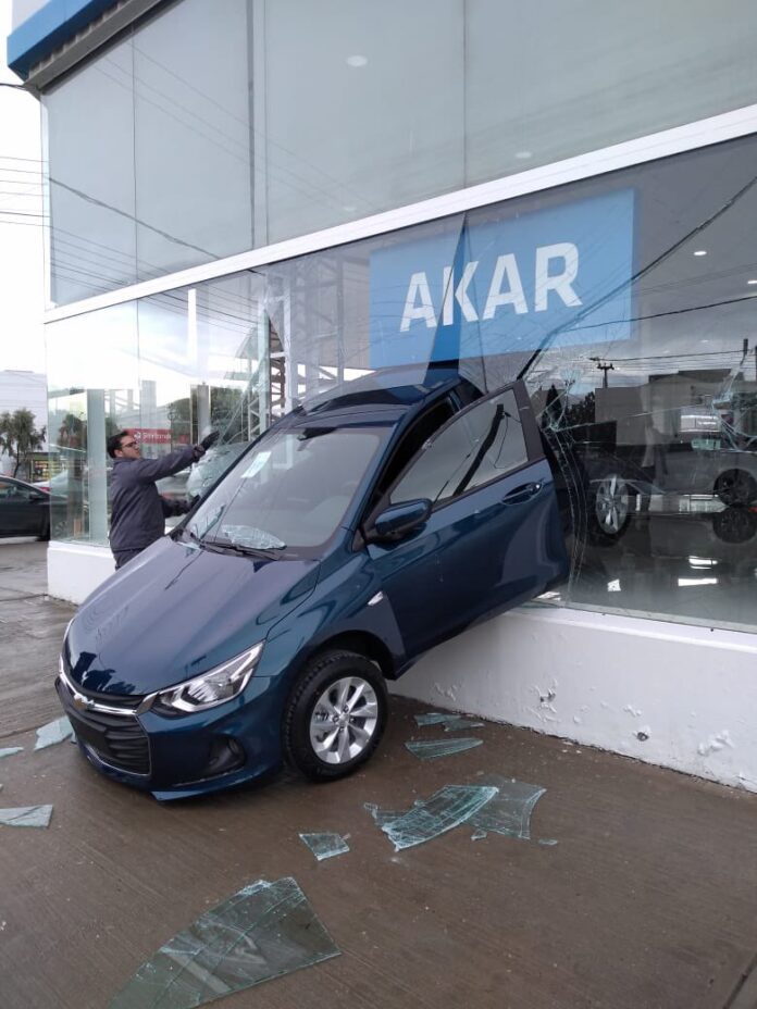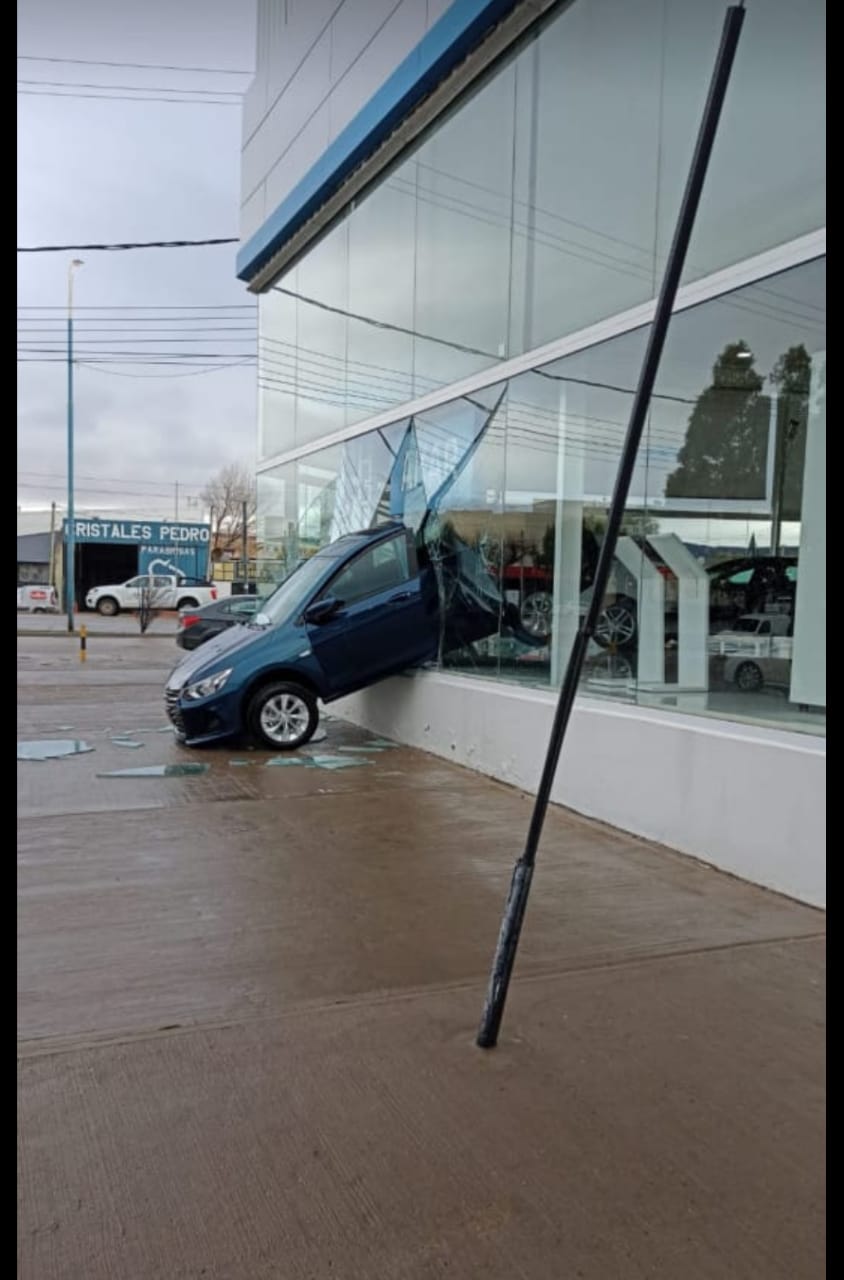 El hecho ocurrió este mediodía en la concesionaria Akar, ubicada sobre Ruta 3. El automóvil quedó «incrustado» en los grandes ventanales del local. No hay datos precisos de lo ocurrido.