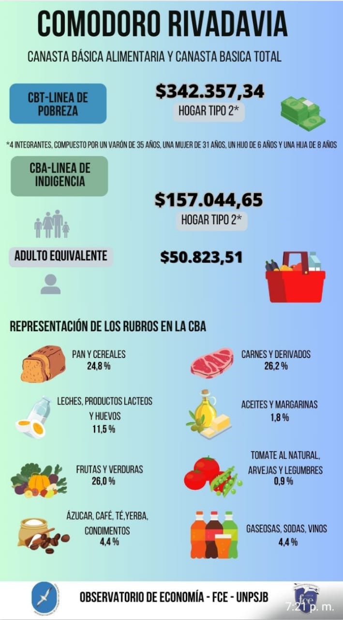 El Observatorio de Economía de la Facultad de Ciencias Económicas de la Universidad de la Patagonia San Juan Bosco, dio a conocer los datos de las variaciones de la canasta básica familiar de la región.